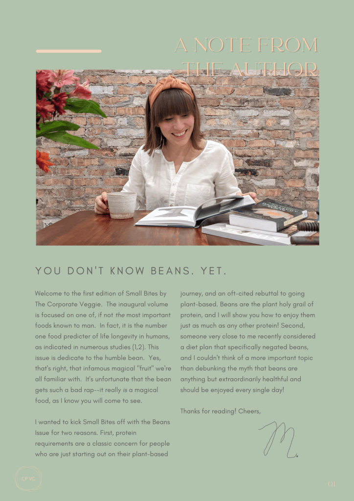 Small bites, Vol. 1: Beans Posted bythecorporateveggieApril 25, 2022Posted inSmall BitesTags:nutrition, plantbased, vegan, wholefoodplantbased small-bites-volume-1-beansDownload Share this: Share on X (Opens in new window) X Share on Facebook (Opens in new window) Facebook Like Loading... Related